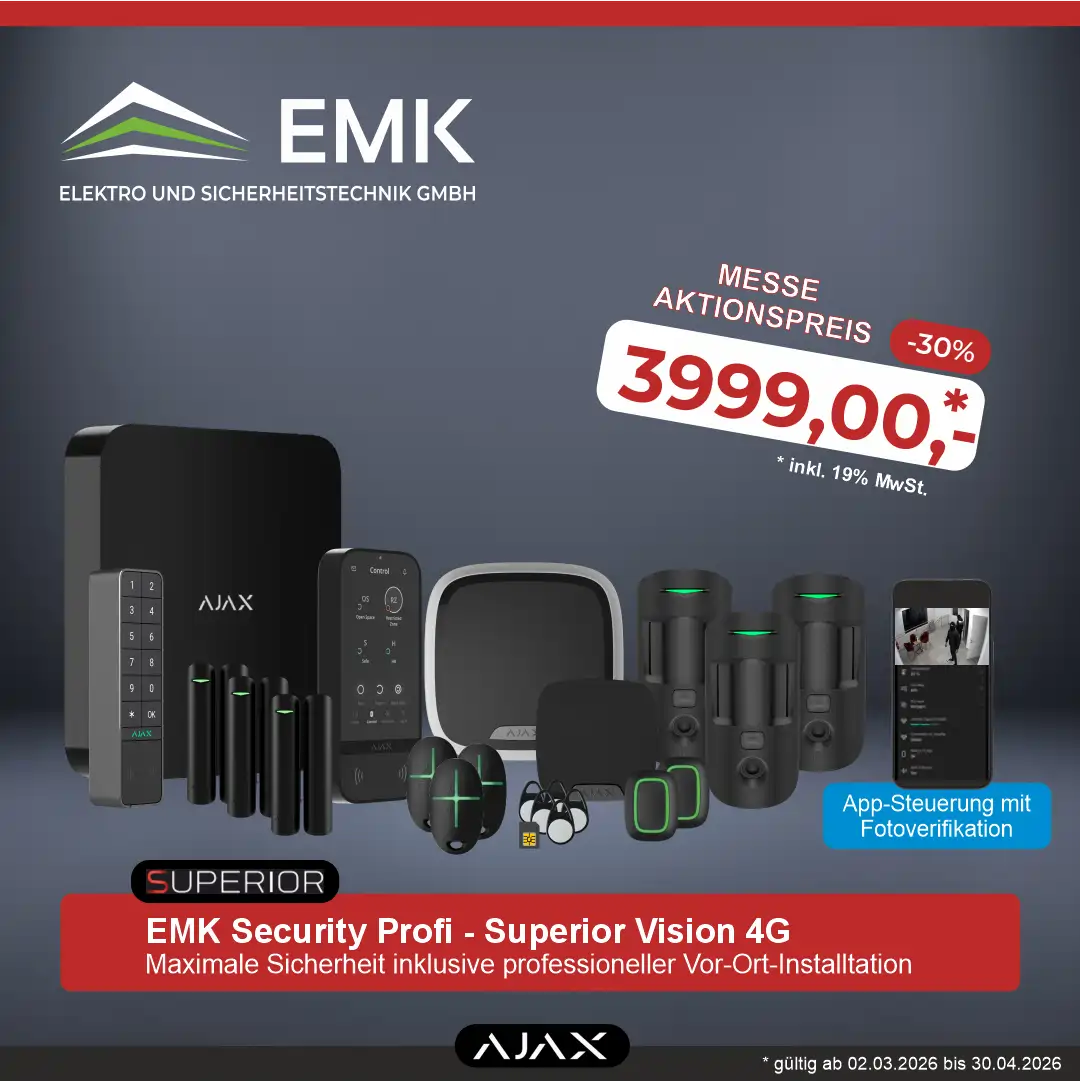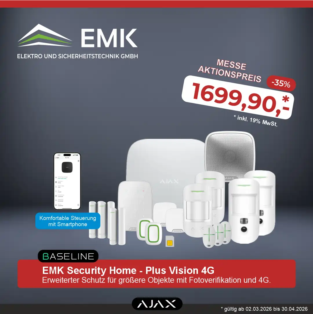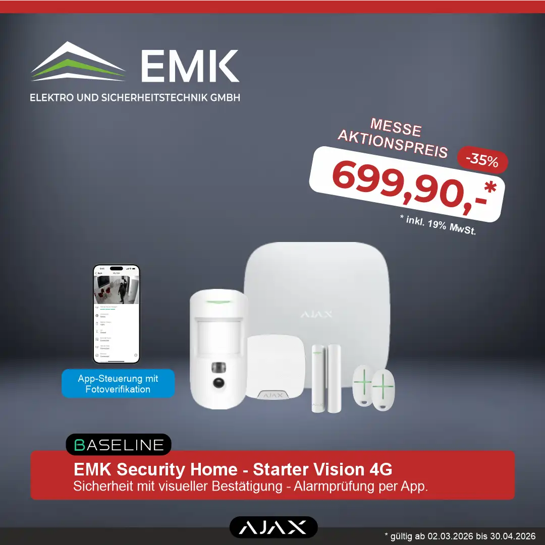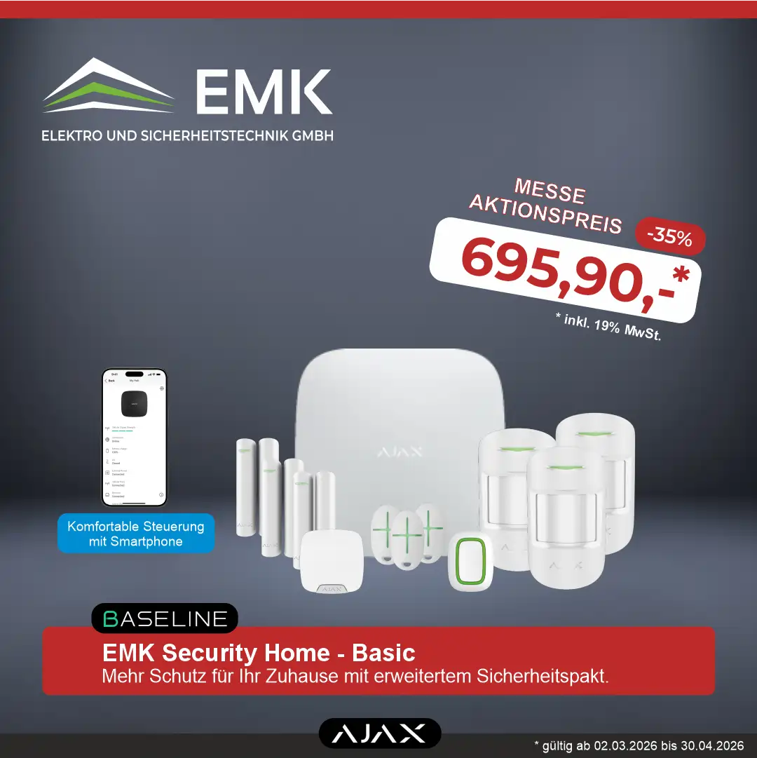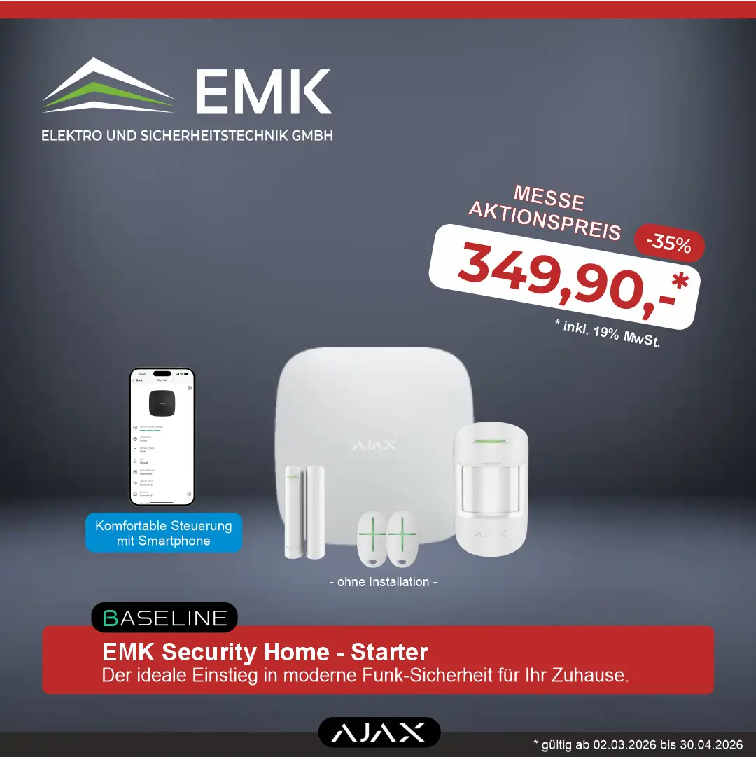 Mit dem EMK Security Home – Starter erhalten Sie eine vollwertige Funk-Alarmanlage auf Basis der bewährten AJAX Baseline Technologie. Das System bietet zuverlässigen Schutz vor Einbruch, lässt sich komfortabel per Smartphone steuern und kann jederzeit flexibel erweitert werden.